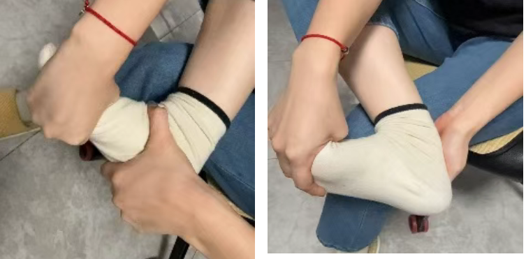 2.双手握住足部,像拧毛巾一样小幅度轻轻左右拧动前足和后足,不应该感受到关节部的疼痛,重复20-30次。