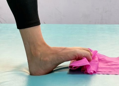 将毛巾放在地板上,赤足踩在上面,保持足跟固定在地面,将脚趾尽量分开后下压,再聚拢用力抓起毛巾,然后松开,每组重复10-20次,共2组。