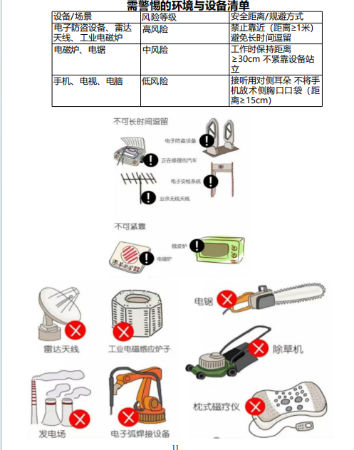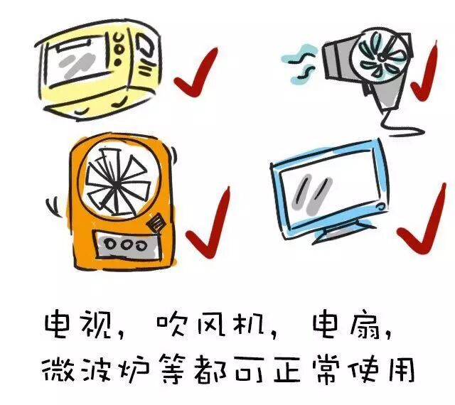 家用设备(可放心使用):电视机、冰箱、洗衣机、微波炉、电饭煲、电脑、收音机、电热毯、电动剃须刀、手机等。使用微波炉时,确保门关好即可。