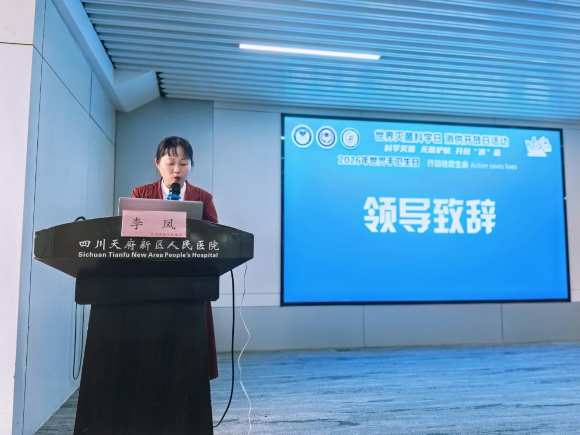 四川天府新区人民医院党委委员、纪委书记李凤在开幕式上致辞,她代表医院党委,感谢各基层医疗机构及医院内各位医务人员的积极参与,并对此次活动的创新联合开展表示充分的肯定。“世界灭菌科学日”号召我们揭开消毒供应中心的神秘面纱,让科学灭菌流程“看得见、信得过”。而“世界手卫生日”则提醒我们,最简单的洗手动作,承载着对生命的最高敬畏。党建引领业务,在医院党委的坚强领导下,通过大家的共同努力,我们一定能够把消毒灭菌以及手卫生工作做实、做细、做出品牌,为医院高质量发展筑牢最坚实的安全底座!