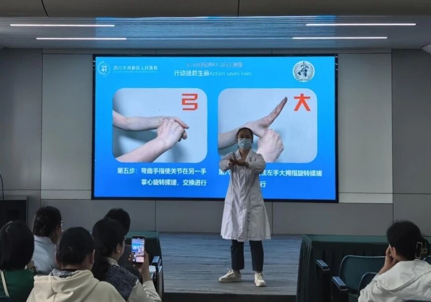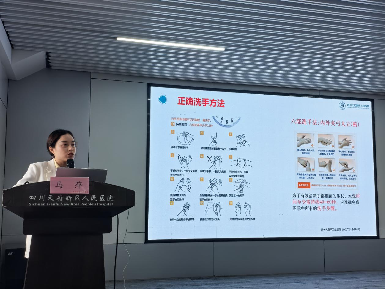 四川天府新区医院感染质量控制中心主任、四川天府新区院感部部长马萍以“从规范到行动、筑牢安全防线”为题做了手卫生专题科普宣讲。