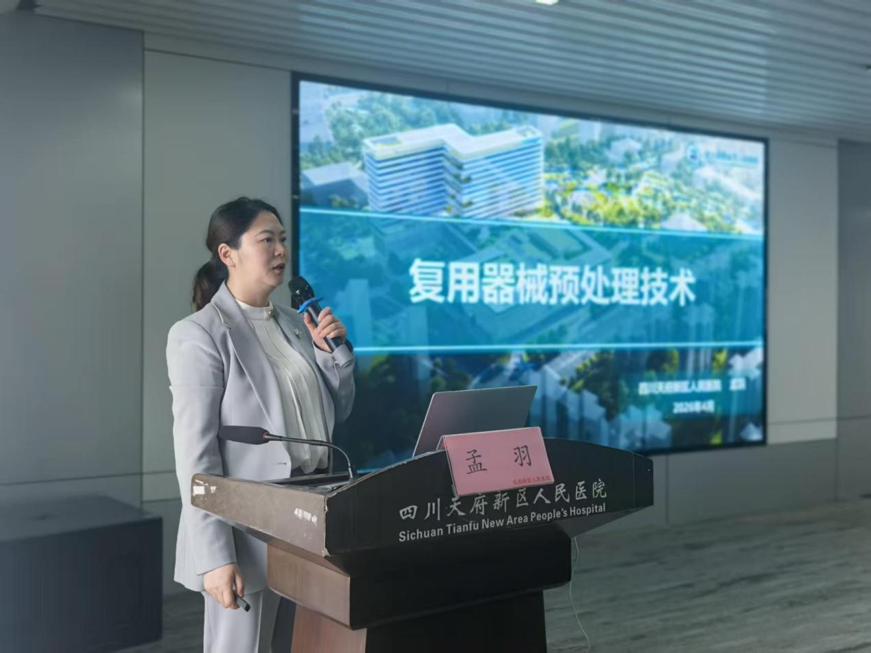 四川天府新区消毒供应医疗质量控制中心主任、四川天府新区人民医院消毒供应中心护士长以“复用器械预处理技术”为题做科普宣讲。
