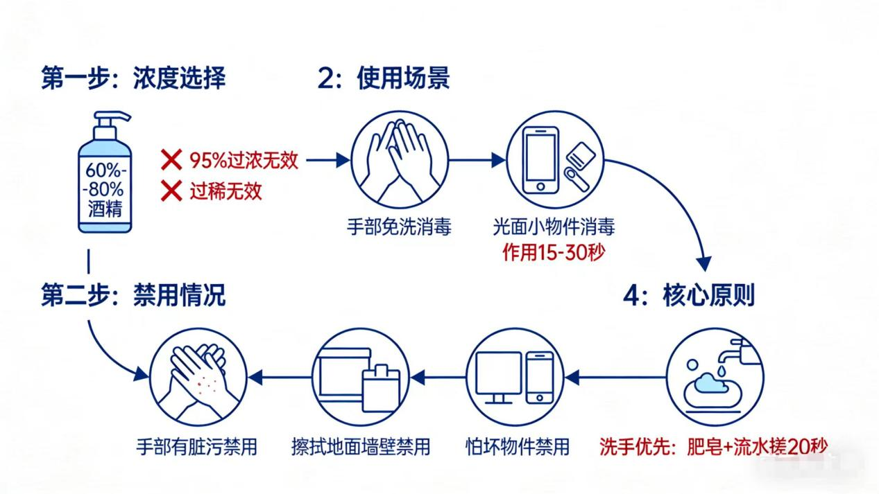 认准60%-80%的酒精:太浓(比如95%)会给病毒“裹保鲜膜”,太稀又杀不死病毒。