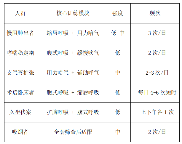 急性感染期、发热、咯血、不稳定心绞痛、近期气胸者暂不执行;训练中出现胸闷、头晕、血氧饱和度下降>3%立即停止。